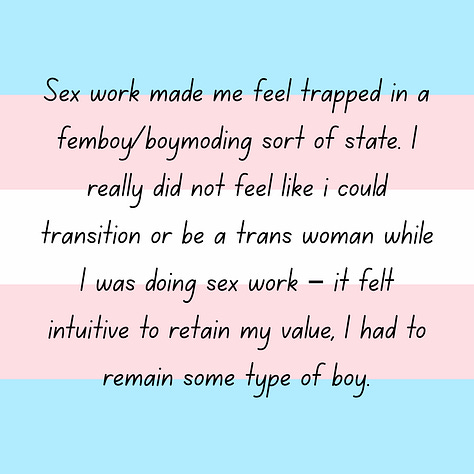 “Sex work made me feel trapped in a femboy/boymoding sort of state. I really did not feel like i could transition or be a trans woman while I was doing sex work – it felt intuitive to retain my value, I had to remain some type of boy.”