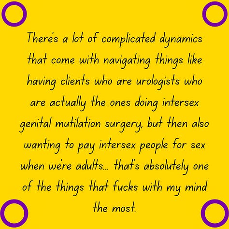 “There’s a lot of complicated dynamics that come with navigating things like having clients who are urologists who are actually the ones doing intersex genital mutilation surgery, but then also wanting to pay intersex people for sex when we’re adults... that’s absolutely one of the things that fucks with my mind the most.”