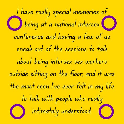 “I have really special memories of being at a national intersex conference and having a few of us sneak out of the sessions to talk about being intersex sex workers outside sitting on the floor, and it was the most seen I’ve ever felt in my life to talk with people who really intimately understood.”
