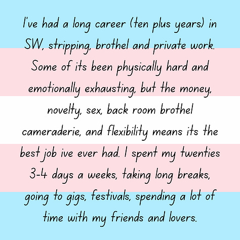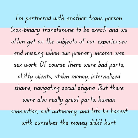 “I’m partnered with another trans person (non-binary transfemme to be exact) and we often get on the subjects of our experiences and missing when our primary income was sex work. Of course there were bad parts, shitty clients, stolen money, internalized shame, navigating social stigma. But there were also really great parts, human connection, self autonomy, and lets be honest with ourselves the money didn’t hurt.”