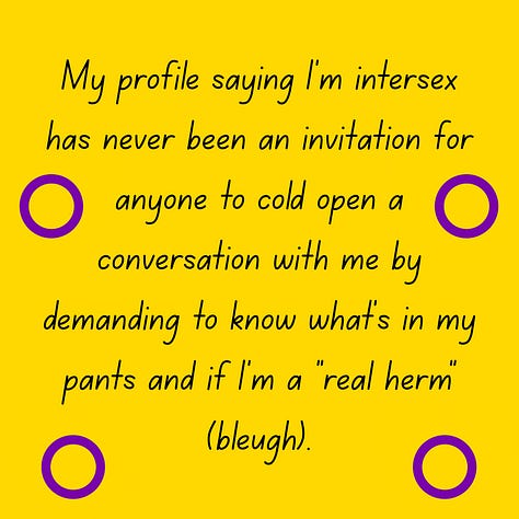 “My profile saying I’m intersex has never been an invitation for anyone to cold open a conversation with me by demanding to know what’s in my pants and if I’m a “real herm” (bleugh).”