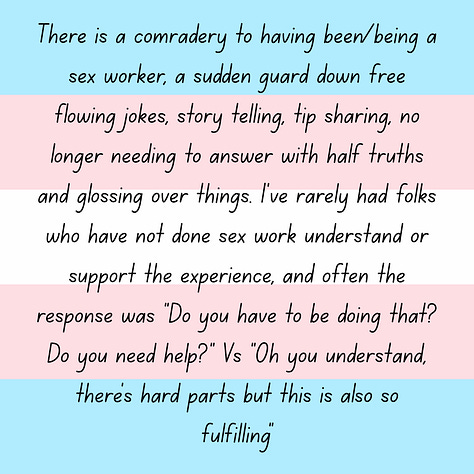 “There is a comradery to having been/being a sex worker, a sudden guard down free flowing jokes, story telling, tip sharing, no longer needing to answer with half truths and glossing over things. I’ve rarely had folks who have not done sex work understand or support the experience, and often the response was “Do you have to be doing that? Do you need help?” Vs “Oh you understand, there’s hard parts but this is also so fulfilling””