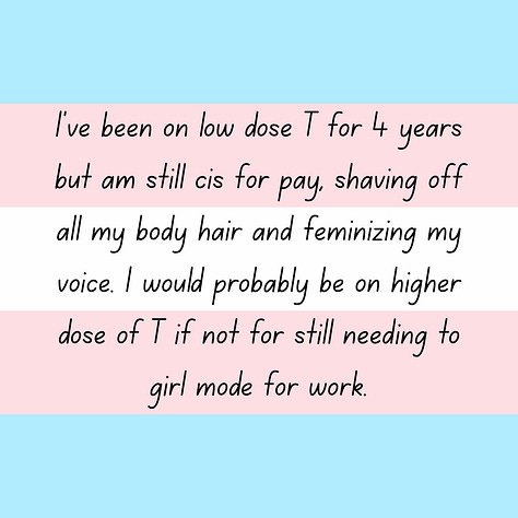 “I’ve been on low dose T for 4 years but am still cis for pay, shaving off all my body hair and feminizing my voice. I would probably be on higher dose of T if not for still needing to girl mode for work.”