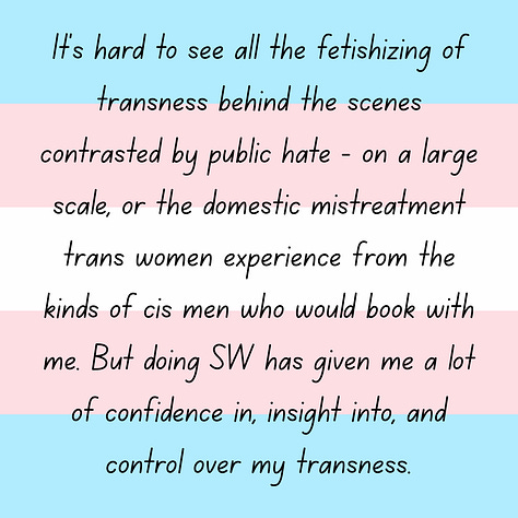 “It’s hard to see all the fetishizing of transness behind the scenes contrasted by public hate - on a large scale, or the domestic mistreatment trans women experience from the kinds of cis men who would book with me. But doing SW has given me a lot of confidence in, insight into, and control over my transness.”
